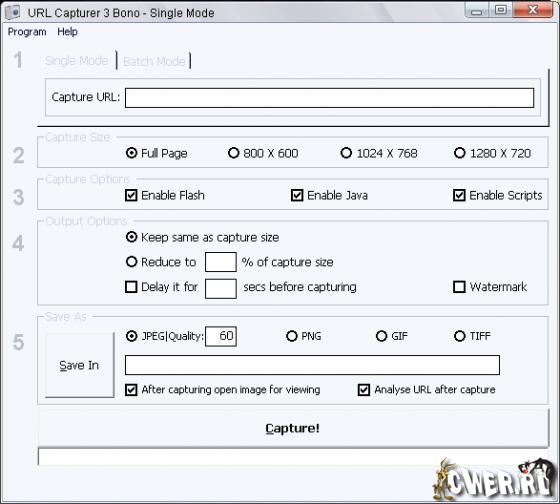 Capturer URL - программа для полноразмерного, во всю длину, преобразования HTML/MHTML/PHP/ASP/CFM страниц вэб-сайтов в изображения JPG, GIF, PNG, BMP и TIF форматов. Предназначено для фиксации текущего состояния, мониторинга изменений и презентаций работы над сайтом. Работает как в ручном, так и в пакетном режимах. Сохранение возможно как полноразмерное, так и уменьшенное, включая эскизы с наложением и без наложения водяных знаков. Присутствует отключение, за ненадобностью, java, activex и scripts содержимого.