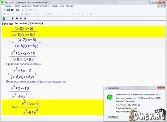 Это Универсальный Математический Решатель - программа, о которой мечтают все школьники и студенты. UMS решает и объясняет решение любого примера, взятого из любого учебника, задачника или просто придуманного Вами. UMS умеет говорить и молчать (по Вашему желанию).