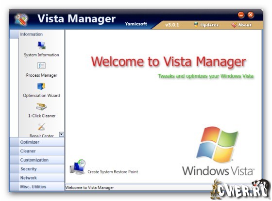 Вышла новая версия программы-оптимизатора для Windows Vista. Она включает более 30 утилит, предназначенных для ускорения работы системы и повышения ее стабильности и безопасности. Программа выдает подробную информацию обо всех компонентах компьютера и о запущенных процессах. С помощью Vista Manager можно ускорить запуск и завершение работы системы, произвести поиск ненужных и дублирующихся файлов и удалять их, исправить ошибки в реестре, провести дефрагментацию реестра, отключить системные обновления и отчеты об ошибках. Кроме этого, доступно множество операций, связанных с настройкой внешнего вида системы: можно изменить содержание контекстных меню, настроить оповещающие сообщения, задать автоматическую смену обоев. Оптимизирует работу с сетью.