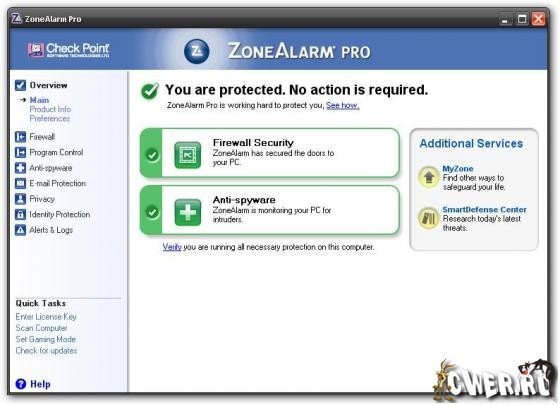 ZoneAlarm Pro - хорошо известный фаерволл, один из лучших в мире на сегодняшний день. Защищает компьютер от внешних угроз при работе в интернете и локальной сети. Блокирует атаку, не давая возможность получить доступ к компьютеру пользователя, имеет режим "стелс" невидимки в сети. Перекрывает выход в Интернет шпионским программам для пересылки личной информации. Защищает программы и операционную систему от вредоносного программного обеспечения и пр. Как необязательное дополнение в файерволл встроена антивирусная Anti-Spyware программы.