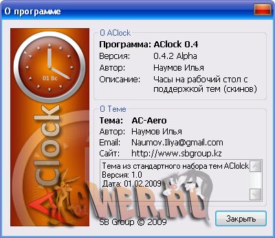 AClock – аналоговые часы на рабочий стол с поддержкой тем (скинов). AClock мало чем отличается от других программ подобного типа, и в то же время это совершенно другие часы. Начиная от тонкостей ресурсопотребления и заканчивая удобным редактором тем (скинов), в котором можно настроить абсолютно любую составляющую (стрелки, дату, надпись и пр.). Благодаря этому внешний вид Ваших часов зависит только от Вашей фантазии и уровня владения Photoshop.
