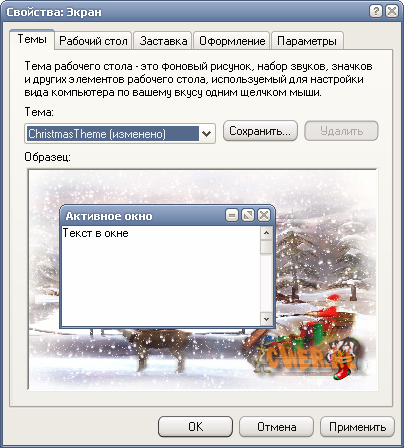 Новогодняя тема оформления интерфейса Windows XP от Microsoft. Включает в себя соответствующее оформление рабочего стола, звуки, иконки и курсоры, а также 3D-заставку.