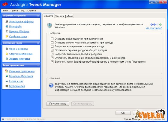 Программа оптимизирует компьютерную память, ускоряет загрузку Windows, повышает быстродействие Microsoft Office, The Bat, FireFox, Opera, чистит реестр и диск компьютера. После дефрагментации реестра BoostSpeed, скорость компьютера возрастет за счет уменьшения фрагментации файлов реестра, уменьшения их размера, а также благодаря устранению ошибок в реестре. Помимо этого BoostSpeed предлагает мощные возможности очистки реестра и диска, что в свою очередь позволит вашему компьютеру работать более быстро и эффективно. AusLogics BoostSpeed единственная программа, которая позволит Вам быстро и качественно произвести настройку Вашей системы на максимальную производительность. Встроенный System Adviser проверит настройки Вашей системы с помощью 50 различных тестов и предложит Вам рекомендации по каждому тесту. Программа в реальном времени проверяет Вашу систему и если находит, что какой-то из параметров можно оптимизировать, то обязательно проинформирует Вас. Язык интерфейса: русский