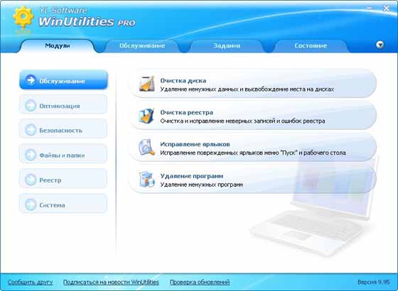 WinUtilities - набор утилит, предназначенных для настройки операционных систем семейства Windows. WinUtilities позволяет находить и удалять критические неисправности, неправильные ссылки и ключи в реестре, поможет правильно удалить приложения и программы, а также очистит историю интернета, cookies и многое другое. Также в программе есть возможность настроить автозапуск программ и изменять скрытые опции ОС.