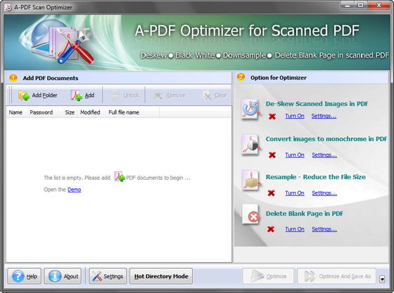A-PDF Scan Optimizer - предоставляет быстрый способ для пакетной оптимизации отсканированных документов PDF. Программа поможет вам исправить "косые" отсканированные изображения, преобразовывать отсканированные изображения в черно-белый или серый цвет, а также отдекорировать изображения и удалять неиспользуемые пустые страницы. A-PDF Scan Optimizer открывает файл PDF и автоматически проверяет наличие смещенных изображений, а затем корректирует перекос с помощью специального алгоритма.