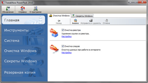 TweakNow PowerPack 2010 изменяет скрытые настройки различных параметров операционной системы. Оптимизируя различные параметры, с помощью этой утилиты можно добиться ускорения работы всей системы в целом. Из программы доступны как программные, так и "железные" настройки. Из софта можно выделить настройку Media Player, Messenger, Internet Explorer, а из железа настройку памяти, процессора и видеокарты. Также доступна функция очистки реестра.