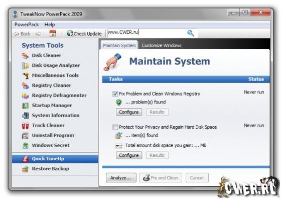 TweakNow PowerPack 2009 изменяет скрытые настройки различных параметров операционной системы. Оптимизируя различные параметры, с помощью этой утилиты можно добиться ускорения работы всей системы в целом. Из программы доступны как программные, так и "железные" настройки. Из софта можно выделить настройку Media Player, Messenger, Internet Explorer, а из железа настройку памяти, процессора и видеокарты. Также доступна функция очистки реестра.