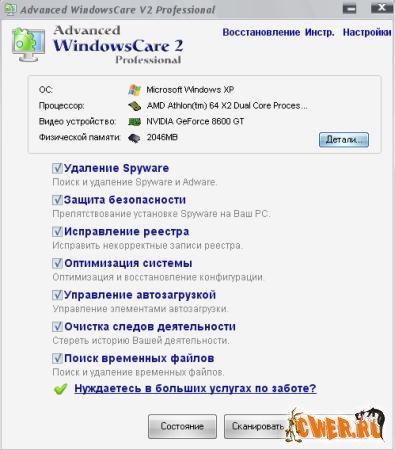 Advanced WindowsCare V2 - это уход и автоматически-неустанная забота о здоровье вашего компьютера в “Один Клик”. Работает по всеми любимому принципу -"Установил и Забыл!", тихо работая в фоновом режиме позволяет постоянно держать пользователю компьютер свободным от ошибок и способствует реализации самых высоких показателей работы, на что способен купленный вами компьютер. Полностью оптимизирует Windows для конкретной поставленной задачи, превращая ваш компьютер в необходимую мощную конфигурацию по желанию: как офисный, игровой или научно-вычислительный, как бы делая из одного компьютера легким переключением ТРИ. Также чистит систему, диски и реестр временных, устаревших, не нужных и нерабочих данных и значений. Немало для одного клика, верно? Рекомендован для простых пользователей не искушенных в настройке и устройстве системы компьютера (большинство) IT экспертами и специалистами во всем мире.
