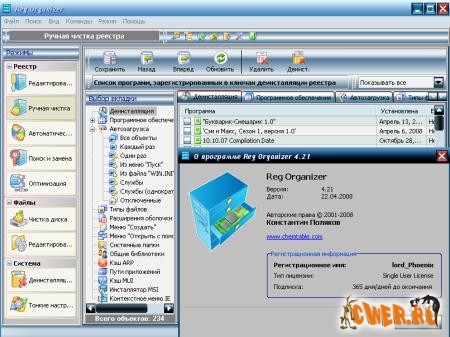 Reg Organizer - это многофункциональная программа для чистки реестра и его обслуживания, а также работы с конфигурационными файлами. Позволяет просматривать и редактировать системный реестр, осуществлять предварительный просмотр импортируемых reg-файлов (в том числе и из Проводника).