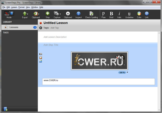 Основная специализация ScreenSteps - создание инструкций и руководств пользователя, в которых приходится много использовать скриншотов. С помощью приложения вы можете создавать так называемые "уроки", которые состоят из серии снимков с соответствующими примечаниями и пояснениями. Отметим также, что в каждый снимок можно обрабатывать по своему усмотрению, для чего в комплекте идет неплохой набор инструментов - масштабирование, обрезка, выделение объектов, нумерация.