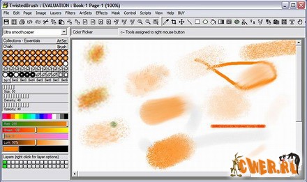 Pixarra TwistedBrush - программа для художников. Она имеет большое количество самых разнообразных инструментов для рисования, от красок до мелков и карандашей. Эта программа глубоко поражает буквально с первого запуска. Интерфейсом Twisted-Brush мало похож на другие редакторы, хотя и предоставляет все необходимые возможности: работа с буфером обмена, зуминг и, конечно же, рисование. Причем рисующий инструмент только один — кисточка, зато количество (более 1500 штук!!!) и качество пресетов для рисования, а также многообразие форм и регулируемость размеров и цветовой гаммы позволяют человеку, не особо одаренному художественными талантами, буквально за пару минут изобразить то, что — возможно, более аккуратно и качественно, конечно — профессионал, работающий в другом редакторе, рисовал бы, наверное, не один час.