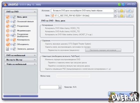 Вышла новая версия программы, которая совмещает в себе возможности копирования DVD, преобразования видео в разные форматы и записи на диски. Программа успешно выполняет как создание копий дисков, так и подготовку видео в форматы, поддерживаемые мобильными устройствами, такими как iPod и PSP (MPEG-4/H.264 MP4). При копировании DVD можно выбрать один из нескольких режимов: полное копирование, копирование только основного фильма, выбор порядка воспроизведения клипов. Программа поддерживает и многие виды защиты, такие как CSS, RC, RCE, APS, UOPs, ARccOS, RipGuard, FluxDVD, CORE X2. Кроме этого, она может восстанавливать информацию даже в том случае, если файл IFO не читается.