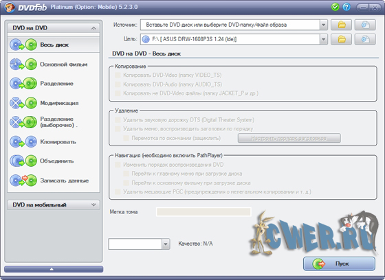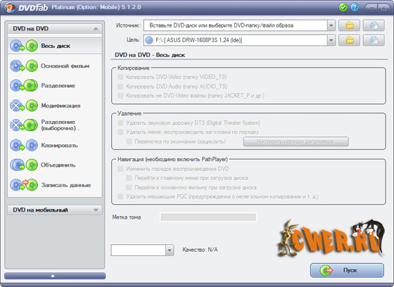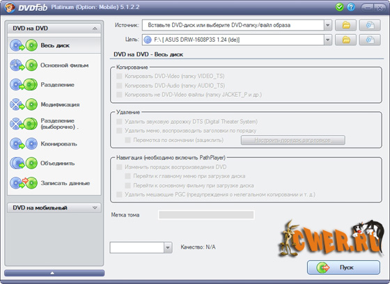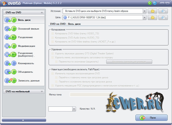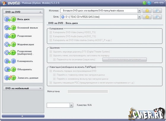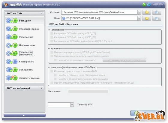 DVDFab Platinum – мощный, многофункциональный программный продукт для копирования DVD дисков с возможностями гибкой обработки видеопотока. Программа является одной из лучших на сегодняшний день, из инструментов для копирования, разбиения, пережатия и конвертирования DVD дисков с фильмами. Снимает все защиты и ограничения с диска и при желании пережмет диск большой емкости и вместит его в обыкновенную пустую DVD болванку с минимальными потерями качества (DVD9->DVD5) или разобъет фильм на два диска с полным переносом его меню, удалит всю рекламу, запишет только фильм и многое другое. Программа имеет интуитивно понятный, мультиязычный интерфейс включая русский.