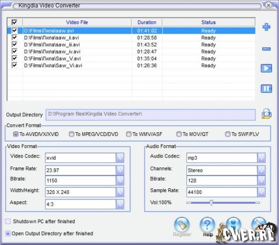 Kingdia Video Converter — многофункциональный видеоконвертер. Его особенность в поддержке огромного числа форматов. Программа может конвертировать видео в AVI, WMV, MPEG, MOV, SWF, FLV и в другие форматы. В частности, поддерживается формат MP4б который используется в Sony PSP, Apple iPod, Archos DVR и Creative Zen, форматы 3GP и 3G2, Real Video (RM, RMVB).