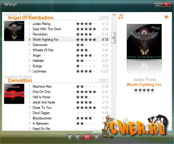 Winyl - небольшой, не требующий много системных ресурсов проигрыватель аудио. Разработчики обещают новый подход к организации вашей музыкальной коллекции. Помимо ведения медиабиблиотеки программа может предложить скины на выбор, простой интерфейс, отличный звук, рейтингование композиций, поддержку графики для обложек альбомов и многое, многое другое, вплоть до поддержки Windows Vista.