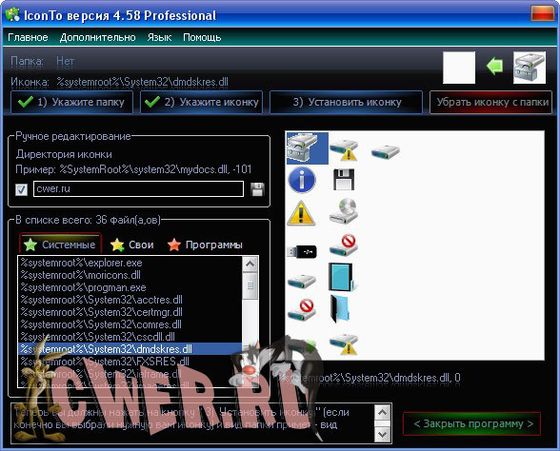 Программа предназначена для быстрого и удобного изменения вида (значка) папок на любые указанные вами, помимо этого программа способна извлекать значки из ресурсов, как по отдельности, так и все сразу. В ней содержится небольшой список системных библиотек, с которых можно устанавливать иконки.