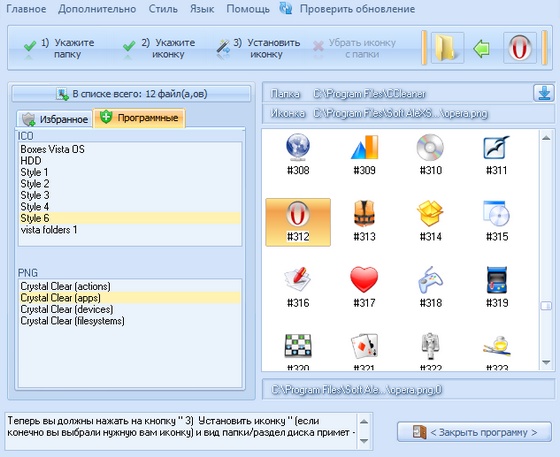Программа IconTo предназначена для быстрого и удобного изменения вида значка папок и разделов диска на любые указанные вами (ICO, CUR, ICL или из ресурсов DLL, EXE и т.д.) в операционных системах семейства Windows. Для более быстрого доступа к избранным значкам в IconTo содержится небольшой список системных ресурсов Windows, в которых находятся значки, список, который, можно пополнять самостоятельно. Так же, в программе присутствуют встроенные значки, состоящие из разных стилей и подходящие под разные операционные системы, количество которых превышает 300 штук.