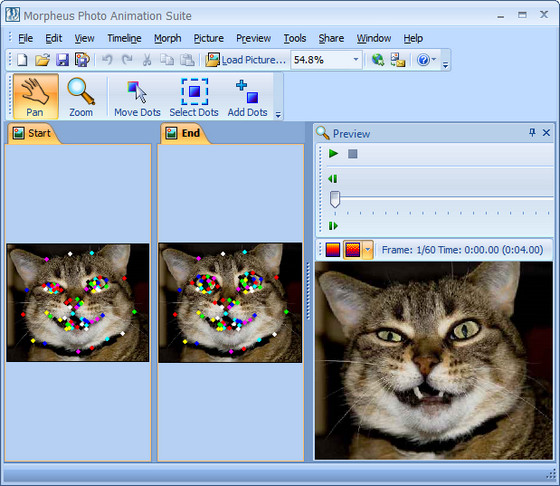 Sqirlz Morph - программа для искажения (морфинга) изображений и последующего сохранения этого процесса в виде анимации. В отличие от других подобных утилит, Sqirlz Morph позволяет не только искажать рисунки, но и одновременно плавно переходить из одной картинки в другую, причем, количество возможных переходов почти не ограничивается.
