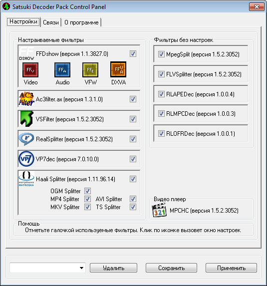 Satsuki Decoder Pack – содержит большое количество кодеков, необходимых для просмотра видео и прослушивания аудио, а также утилит, которые могут потребоваться вам для просмотра цифровых фильмов и роликов.
