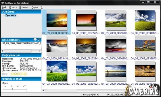 Программа поможет вам с легкостью создавать фотоальбомы. Имеет простой и доступный интерфейс (поддержка языковых модулей). Поддерживает большое число графических форматов. Многоуровневая структура альбомов. Комментарии для каждой фотографии, с возможностью прикрепления звуковых файлов и вставки OLE объектов (любые файлы или объекты). Присутствует большое число графических фильтров (включая возможность убирания "красных глаз"). Поиск фотографий. Печать. Создание веб-галерей, поддержка Highslide JS, позволяющего создавать интерактивные веб-галереи со слайдшоу!