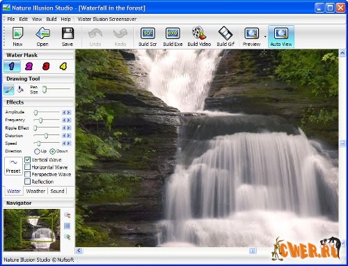 Nature Illusion Studio поможет Вам превратить обычные снимки в прекрасные анимированные пейзажи. Программа позволяет накладывать разные графические и звуковые эффекты, и затем конвертировать результат в экранную заставку, исполняемый файл, анимированный рисунок или видео-файл. Загружаете свою любимую фотку с пейзажем, выделяете с помощью масок области, которые нужно оживить (напр. поверхность водоема, ручей, водопад и т.д.), добавляете звук (шум прибоя, пение птиц, журчание воды), можно добавить падающий снег или дождь. Вобщем, теперь вы можете самостоятельно создавать скринсейверы профессионального качества, делать авторские анимированные GIF на основе ваших фото.