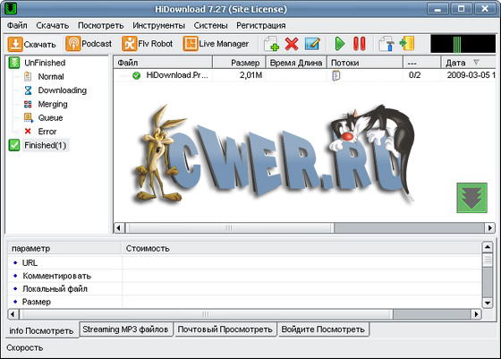 HiDownload - менеджер загрузок. Поддерживает работу по протоколам HTTP, FTP, RTSP (Windows Media), PNM, MMST и MMSU (это значит, что потоковое аудио - RA, RM и Apple Quicktime Streaming - можно "скачать" без проблем). Может работать через прокси, позволяет просматривать архивы и скачивать из них только необходимые файлы, позволяет сохранять Flash, имеется встроенный поиск MP3-файлов.