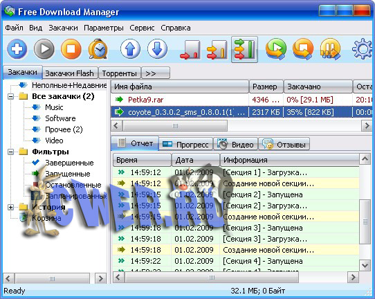 Free Download Manager - альтернативный менеджер закачек. Содержит встроенный планировщик, докачивает файлы, для ускорения работы разбивает задания на части. Может скачивать файлы в трех режимах загрузки полосы. Доступны и продвинутые настройки для работы с конкретными серверами (имя, пароль, число подключений, группа и прочее).