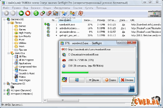 GetRight - менеджер закачек. Программа поддерживает докачку, разбиение файлов для многопоточной загрузки, поиск зеркал и файлов, работу с прокси-серверами и мониторинг кликов в буфере обмена и браузерах Internet Explorer, Netscape Communicator, Opera, Mozilla, NetCaptor и т.д. Интегрируется в Windows shell и может работать совместно с антивирусным ПО. Есть встроенный браузер для просмотра FTP-сайтов, утилита для дозвона и планировщик задач для работы по расписанию. Программа имеет удобный интерфейс и легко конфигурируется.