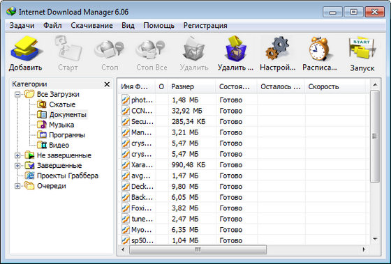 Internet Download Manager - предназначен для организации загрузок файлов из Интернет. Различные методы ускорения загрузки, динамическая сегментация файлов и одновременное скачивание нескольких частей, использование свободных открытых подключений без реконнекта и многое другое. Встроенная звонилка для соединения по расписанию. поддержка файрволлов, прокси и зеркал, FTP and HTTP protocols, редиректов, куки, очередей закачки, авторизации пользователя. Internet Download Manager интегрируется в Microsoft Internet Explorer, Netscape, MSN Explorer, Opera and Mozilla и автоматически перехватывает закачки. Зачастую увеличивает скорость скачивания на 500%. На странице программы есть диаграммы тестов с другими менеджерами закачек.