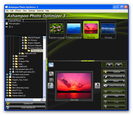 Ashampoo Photo Optimizer - простая в использовании программа для оптимизации и улучшения качества цифровых фотографий. Утилита позволяет корректировать контрастность, яркость и цветовой баланс. Все действия в программе производятся по нажатию необходимой кнопки на панели инструментов. Также, в данной программе предусмотрена пакетная обработка графических файлов. С помощью этой утилиты, снимки становятся ярче, светлее, приобретают четкость и контрастность. Если сравнивать показатели до и после преображения, заметно, насколько силен программный алгоритм оптимизации. Поработав однажды с этой программой, вы больше не захотите использовать любые другие, во многом – из-за экономии времени. Целые папки с изображениями автоматически просматриваются и преобразовываются. Исходные данные автоматически сохраняются в резервной папке и уничтожаются только когда пользователь полностью удовлетворен преображенными фотографиями. Программа обладает приятным пользовательским интерфейсом с многоязычной поддержкой, включая русский язык.