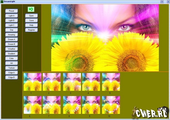 DreamLight Photo Editor - это программа, с помощью которой можно добавлять к цифровым фотографиям различные спецэффекты. Содержит 15 различных фильтров, у каждого фильтра есть по 10 различных эффектов, причем, на одну фотографию можно накладывать сразу несколько фильтров. Среди добавляемых эффектов есть такие, как: различные световые фильтры, звезды, специальные фильтры, делающие снимки очень впечатляющими и мечтательными. Есть также фильтры, позволяющие добавлять эффект погоды, градиенты, колоризацию, текстуры, выделение краев и другие. В общей сложности DreamLight Photo Editor содержит 150 различных эффектов, с помощью которых можно создавать тысячи незабываемых красивых фотографий.