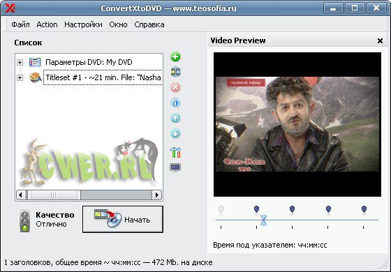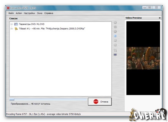 ConvertXtoDVD - программа предназначена для преобразования видео в формат, совместимый с DVD Video, и последующей записи содержимого на DVD. Программа поддерживает видеофайлы Mpeg, Mpeg, Mpeg4, MP4, VOB, WMV, DV, AVI, а также потоковое видео. Для работы программы не нужны внешние AVI-кодеки, поскольку она использует собственные.