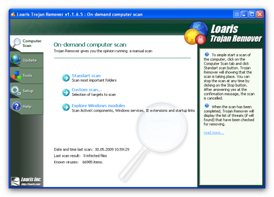 Loaris Trojan Remover поможет полностью очистить Ваш компьютер от всех агрессивных угроз! Ваш компьютер будет чист и будет работать значительно быстрее - Ваша Конфиденциальность будет Защищена! Приложение Loaris Trojan Remover проектировалось как средство удаления вредоносных программ: трояны, черви, рекламные и шпионские программы - когда стандартное программное антивирусное обеспечение или не в состоянии обнаружить их, или не в состоянии фактически удалить их. Стандартная антивирусная программа хороша в обнаружении вредоносных программ, но не всегда справляется с их удалением. Trojan Remover проектируется особо для удаления этих программ без необходимости ручного их удаления. Программа также удаляет дополнительные системные обновления, которые были привнесены вредоносным программным обеспечением. Trojan Remover просматривает Все файлы, загруженные во время старта системы, на наличие Adware, Spyware, Троянцев, Интернет Червей и др. Доступны два типа. Стандартное сканирование быстро просматривает систему без потребности в дальнейшей конфигурации параметров сканирования. Пользовательское сканирование позволит выбрать любую из папок для сканирования.