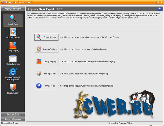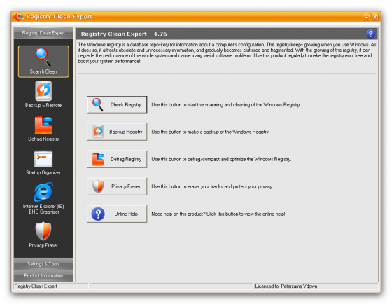 Registry Clean Expert - программа для сканирования реестра на предмет неправильной или устаревшей информации. Благодаря изменению таких данных в реестре система начинает работать быстрее и без ошибок. Программа имеет опцию резервного копирования и восстановления реестра на случай, если система даст сбой. Кроме этого, используя Registry Clean Expert, вы можете управлять приложениями, которые запускаются вместе с Windows и Internet Explorer. Также утилита включает в себя модуль поиска "шпионских" модулей. Имеет интуитивно-понятный интерфейс и работает на платформах Windows Vista, XP, 2003, 2000, ME и Windows 98.