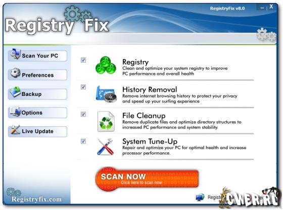 RegistryFix выявляет и устраняет ошибки в системном реестре Windows, причем делает это очень хорошо, и без необходимости перезагрузки компьютера для того, чтобы изменения вступили в силу. Список областей очистки реестра довольно широк: - программная область, - установка/удаление программ, - установленные шрифты, - совместно используемые файлы, - файлы помощи, - область автозагрузки программ, - системные сервисы и драйвера - ярлыки и т.д. Перед началом процесса чистки можно сделать резервную копию реестра.