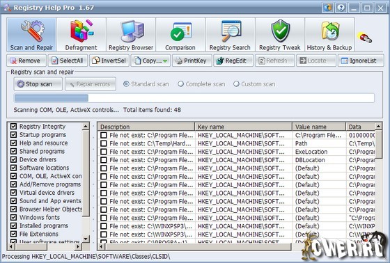 jv16 PowerTools - одна из лучших программ для работы с системным реестром. Включает в себя инструменты для работы с реестром: мощный менеджер реестра - позволяет работать со списком программ из автозагрузки и деинсталляции, со списком зарегистрированных в системе типов файлов, расширений, контекстным меню IE (с тем, в которое часто вставляют свои пункты менеджеры закачек) и некоторыми другими. Этот менеджер часто помогает вручную удалить остатки после автоматической очистки реестра программы. Возможно использование в локальной сети.