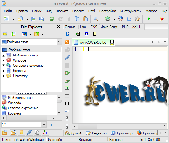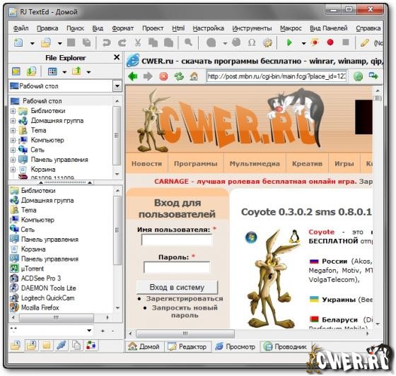 RJ TextEd - юникодный редактор со множеством возможностей для редактирования текста, html-документов, java-скриптов и т.д. Открытие множества документов в многовкладочном окне, подсветка и проверка синтаксиса, подсказки при вводе кода, закладки, неограниченное undo/redo, редактор css, html-превью, встроенный ftp-клиент, поддержка email, поддержка drag'n'drop, поддержка скинов и многое другое.