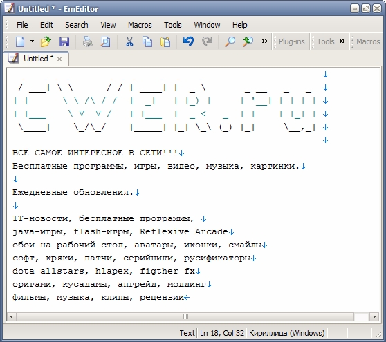 EmEditor - отличный текстовый редактор для программистов, веб-дизайнеров и обычных пользователей с очень большими возможностями: настраиваемый тулбар, отдельная панель макросов (в качестве макросов могут выступать также JavaScript и VBScript), запись движений мыши и клавиатурного набора, открытие файлов даже не большого, а огромного размера, работа сразу с несколькими файами, подсветка синтаксиса ASP, C#, C++, CSS, HTML, Java, JavaScript, JSP, Pascal (Delphi), Perl, Python, PHP, SQL, VBScript и др., поддержка подключения плагинов, расширенные опции поиска и т.д.