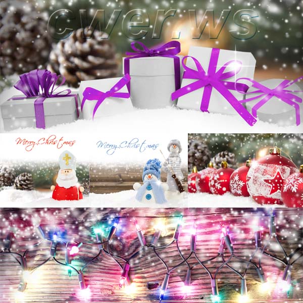 Высококачественный клипарт в растровом формате, который представляет собой профессиональные фотографии элементов дизайна новогодних композиций, изображенных на деревянных текстурах.