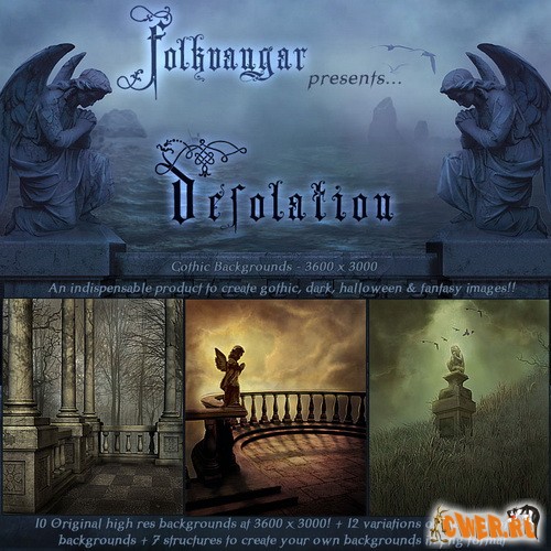 10 готических фонов (300 dpi, 3600x3000 пик), 12 готических сцен на основе фонов, и бонус - 7 файлов в PNG формате с элементами готики, для воплощения Ваших фантазий