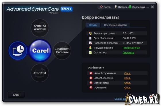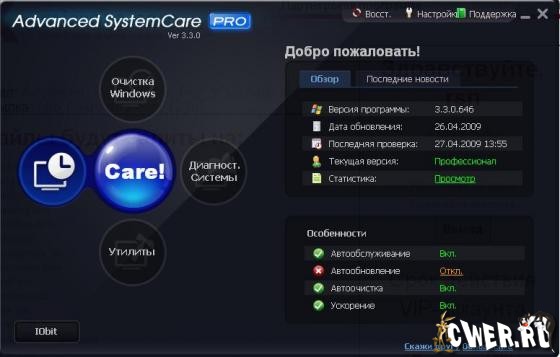 Advanced SystemCare Pro - программа, включающая в себя множество модулей для оптимизации, настройки и повышения производительности компьютеров, находящихся под управлением операционными системами Windows 2000/XP/Vista. Благодаря возможностям программы вы сможете очистить ПК от шпионского и рекламного ПО, обнаружить и заранее устранить возможные угрозы и бреши в системе безопасности ОС, исправить ошибки в системном реестре, очистить временные и ненужные файлы, управлять списками автозагрузок, оптимизировать работу систем.