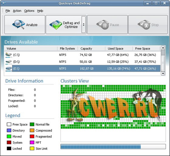 Quicksys DiskDefrag оперативно дефрагмантирует диски и разделы системы. В число функций входят оптимизация свободного пространства, установка размера блоков, обзор файлов в кластере, прерывание и остановка текущих процессов, информация о дисководе и карта кластера.