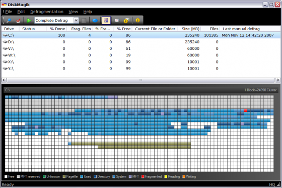 DiskMagik - это умно созданная утилита для дефрагментации жесткого диска для Windows 2000/XP/Vista. DiskMagik имеет несколько мощных возможностей, не включенных в утилиту дефрагментации Windows, включая возможность переорганизовывать и приоритизировать порядок файлов на жестком диске, включая Windows Pagefile, позволяя тем самым быстро получать доступ к файлам по желанию. К тому же, программа включает дефрагментацию при загрузке и нашу эксклюзивную технологию дефрагментации "Proactive Defragmentation".