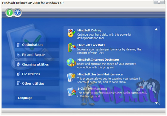 MindSoft Utilities XP - мощный инструмент, содержащий 19 утилит, которые позволяют оптимизировать и настроить систему под управлением Windows XP. Можно дефрагментировать диски, память, оптимизировать соединение с Интернет, очистить диски от мусора, ускорить запуск приложений и многое другое, а также узнать всё относительно аппаратного и программного обеспечения компьютера.