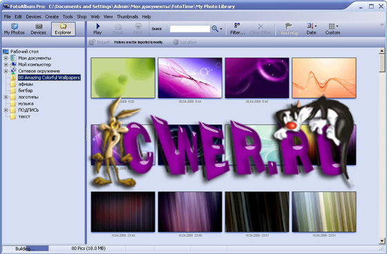 Ulead Photo Explorer - просмотрщик-каталогизатор графики и видео со всеми необходимыми для такого рода программ функциями плюс встроенный аудиопллер. Внешне напоминает ACDSee, да и по возможностям просмотра графики эти программы примерно равны - есть предпросмотр в виде показа уменьшенных копий, режим слайдшоу, просмотр в отдельном окне, изображения можно поворачивать, масштабировать, работать с цветовыми каналами, добавлять надписи.