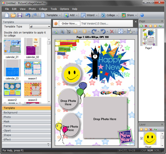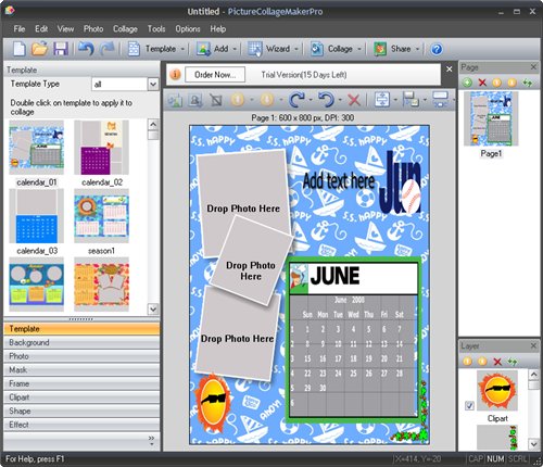 Picture Collage Maker - простая в использовании программа для создания коллажей из ваших фотографий. Простой интерфейс программы и множество шаблонов позволят легко создавать разнообразные фотоколлажи (календари, поздравительные открытки, пригласительные билеты, постеры и т.д.) даже неопытным пользователям. Создание коллажей - это расслабляющее время-провождение, помогающее превращать собранные фотографии в драгоценные воспоминания. Это самый легкий способ создания коллажей с применением вращений, изменения размеров, положений, обрамлений, маскировки, слияния и применением различных эффектов для каждой картинки по-отдельности. Результат может быть сохранен в форматах JPG, BMP, TIFF, GIF, WMF, TGA, PNG или установлен в качестве фонового рисунка для рабочего стола.