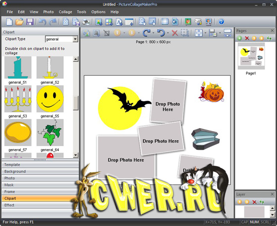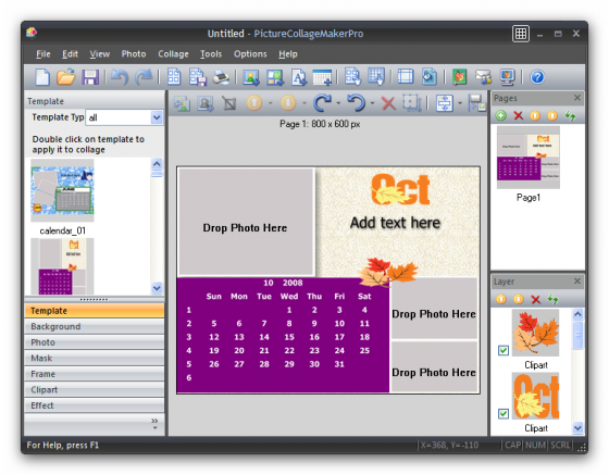 Picture Collage Maker - простая в использовании программа для создания коллажей из ваших фотографий. Простой интерфейс программы и множество шаблонов позволят легко создавать разнообразные фотоколлажи (календари, поздравительные открытки, пригласительные билеты, постеры и т.д.) даже неопытным пользователям. Создание коллажей - это расслабляющее время-провождение, помогающее превращать собранные фотографии в драгоценные воспоминания. Это самый легкий способ создания коллажей с применением вращений, изменения размеров, положений, обрамлений, маскировки, слияния и применением различных эффектов для каждой картинки по-отдельности. Результат может быть сохранен в форматах JPG, BMP, TIFF, GIF, WMF, TGA, PNG или установлен в качестве фонового рисунка для рабочего стола.