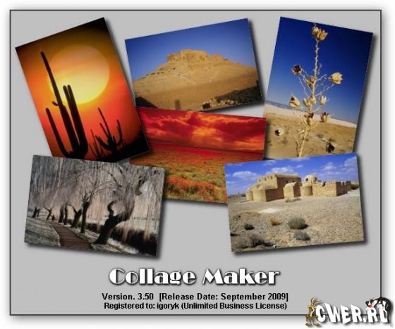 Collage Maker - удобная программа для быстрого создания коллажей. Возможности: создание веб-графики, фотоколлажей и других графических документов, более 80 готовых текстур, поддержка форматов JPG, BMP, TIFF, GIF, WMF, PSP, PSD, сохранение коллажей в JPG, GIF или BMP, маскирование/прозрачность, эффект падающей тени, контроль яркости/контраста, художественное оформление краев документа/фото, цветовые эффекты, преобразование фото в черно-белый вариант, поддержка WMF-формата, масштабирование/вращение фото, функции работы с текстом, функция сглаживания шрифтов и многое другое...