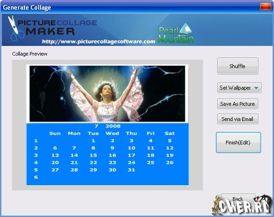 Picture Collage Maker - простая в использовании программа для создания коллажей из ваших фотографий. Простой интерфейс программы и множество шаблонов позволят легко создавать разнообразные фотоколлажи (календари, поздравительные открытки, пригласительные билеты, постеры и т.д.) даже неопытным пользователям. Создание коллажей - это расслабляющее время-провождение, помогающее превращать собранные фотографии в драгоценные воспоминания. Это самый легкий способ создания коллажей с применением вращений, изменения размеров, положений, обрамлений, маскировки, слияния и применением различных эффектов для каждой картинки по-отдельности. Результат может быть сохранен в форматах JPG, BMP, TIFF, GIF, WMF, TGA, PNG или установлен в качестве фонового рисунка для рабочего стола.