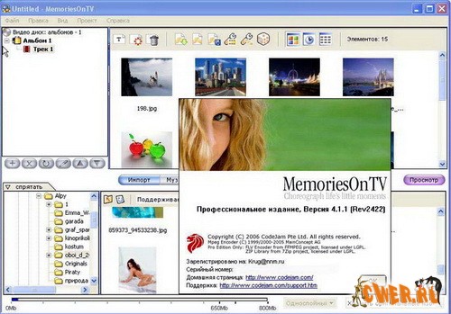 Обновленная версия MemoriesOnTV Pro Clipshow 1.1 Ваши фотографии (формат любой кроме PSD) и/или видеоклипы (mpg, avi, mov, mp4) - это всё, что нужно для создания/записи собственного качественного DVD, VCD или sVCD с потрясающими голливудскими переходными эффектами, музыкальным сопровождением и возможностью просмотра на стандартных DVD, VCD плеерах или на компьютере.